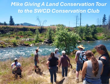 The next site for our Conservation Club tour led us down Highway 22, into the burn area from the 2020 Labor Day wildfires. This site was at a private landowner’s family property along the North Santiam River in Lyons. The Hebings greeted all of the tour attendees with big smiles, happy to share their beautiful home with us. Mike shared sun tea he brewed himself to keep us refreshed as we walked the restoration site and admired all of the beautiful native flowers in bloom.