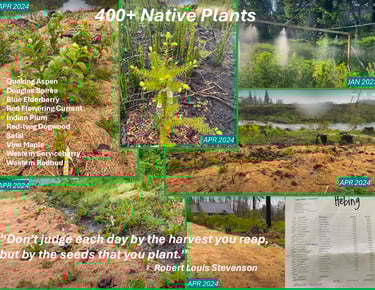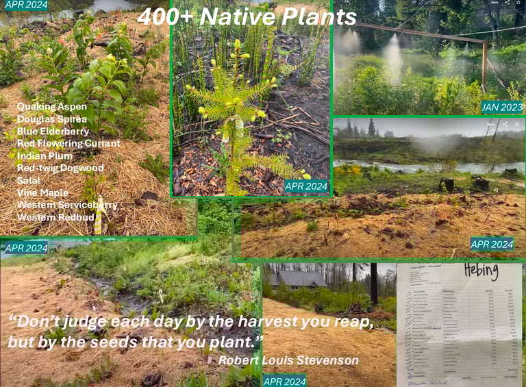 Restoration projects can add up quickly and be quite expensive, especially for a small landowner who has already lost so much to a natural disaster. However, Mike was able to be resourceful and look for free plant giveaways from partnering agencies at the end of planting season and home them in his nursery with irrigation over the summer. He received leftover native willows, Red Osier dogwood, and Douglas fir bareroots and potted them. Making sure he kept them watered over the summer, Mike kept the plants alive so he can plant them in his site at the proper time during the winter.